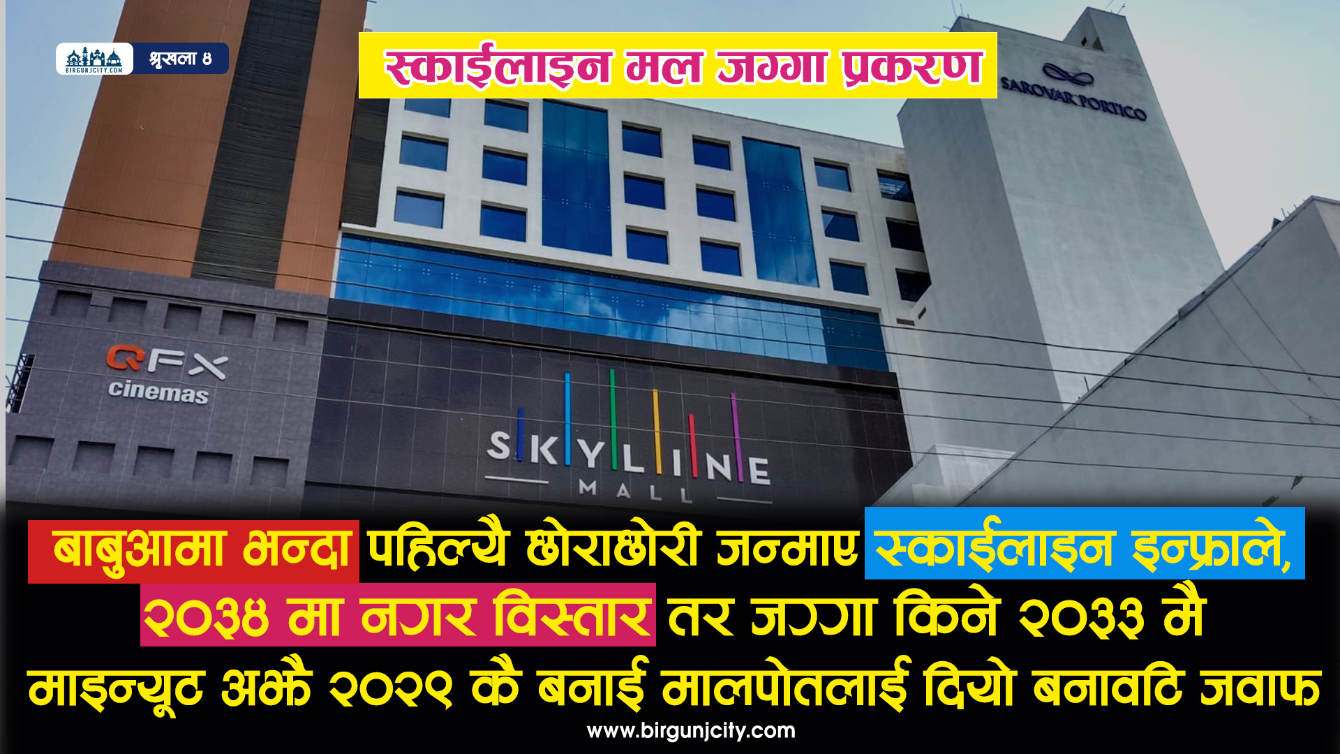 जवाफमा स्काईलाइन मलले बाबुआमा भन्दा छोराछोरी पहिल्यै जन्माएको जस्तरी जवाफ पठाएको छ । मालपोत कार्यालय पर्साले भदौँ २ गते हाल हकभोग गरिरहेकाहरूको नाममा नयाँ नापीमा कुन साविक प्रमाण भिडाई हालसाबिक गरिएको हो त्यसको स्रोत तथा प्रमाण पेश गर्न २१ दिने म्याद जारी गरेको थियो ।