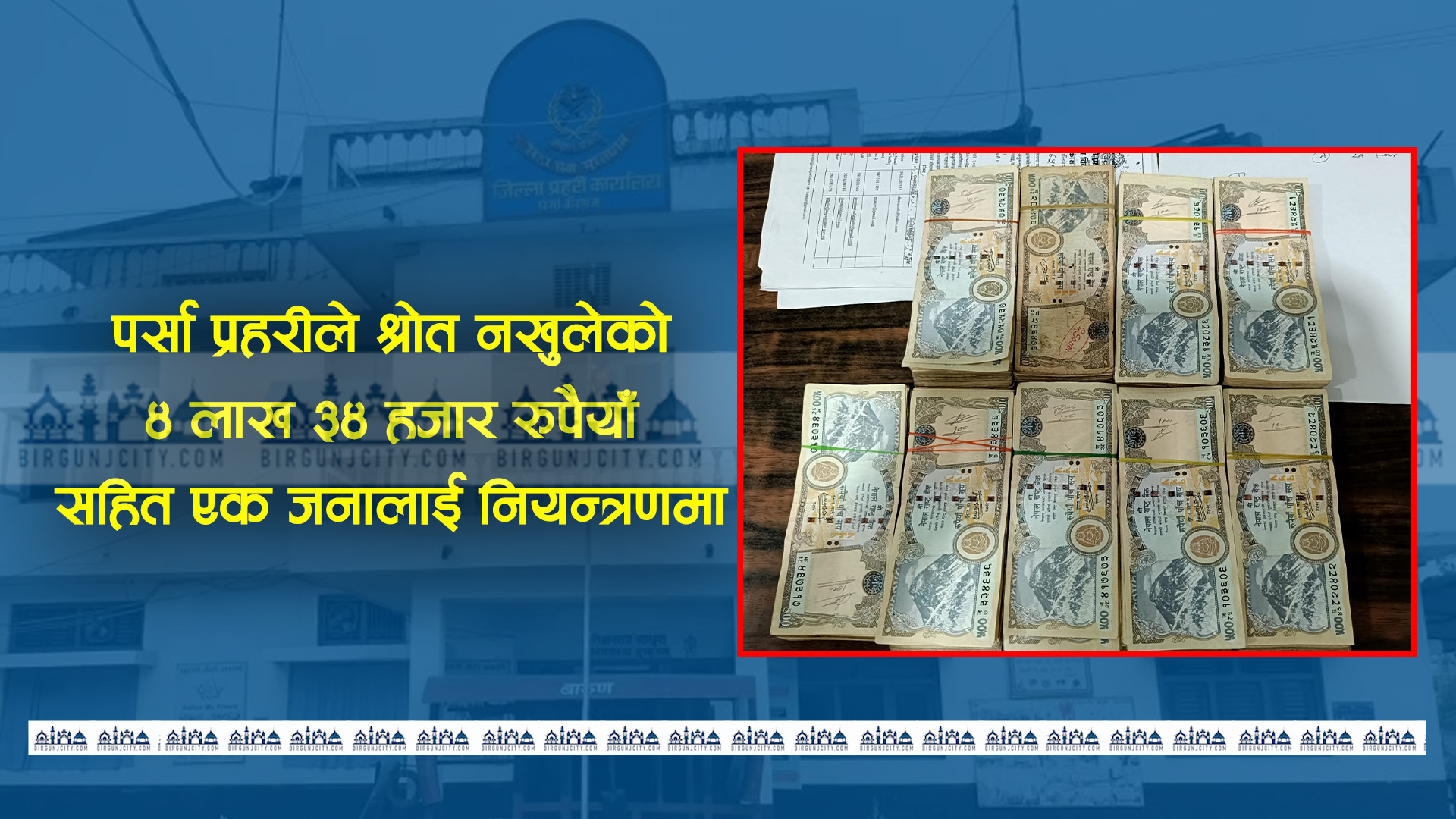 वीरगंज | पर्सा प्रहरीले श्रोत नखुलेको ४ लाख ३४ हजार रुपैयाँ सहित एक जनालाई नियन्त्रणमा लिएको छ ।