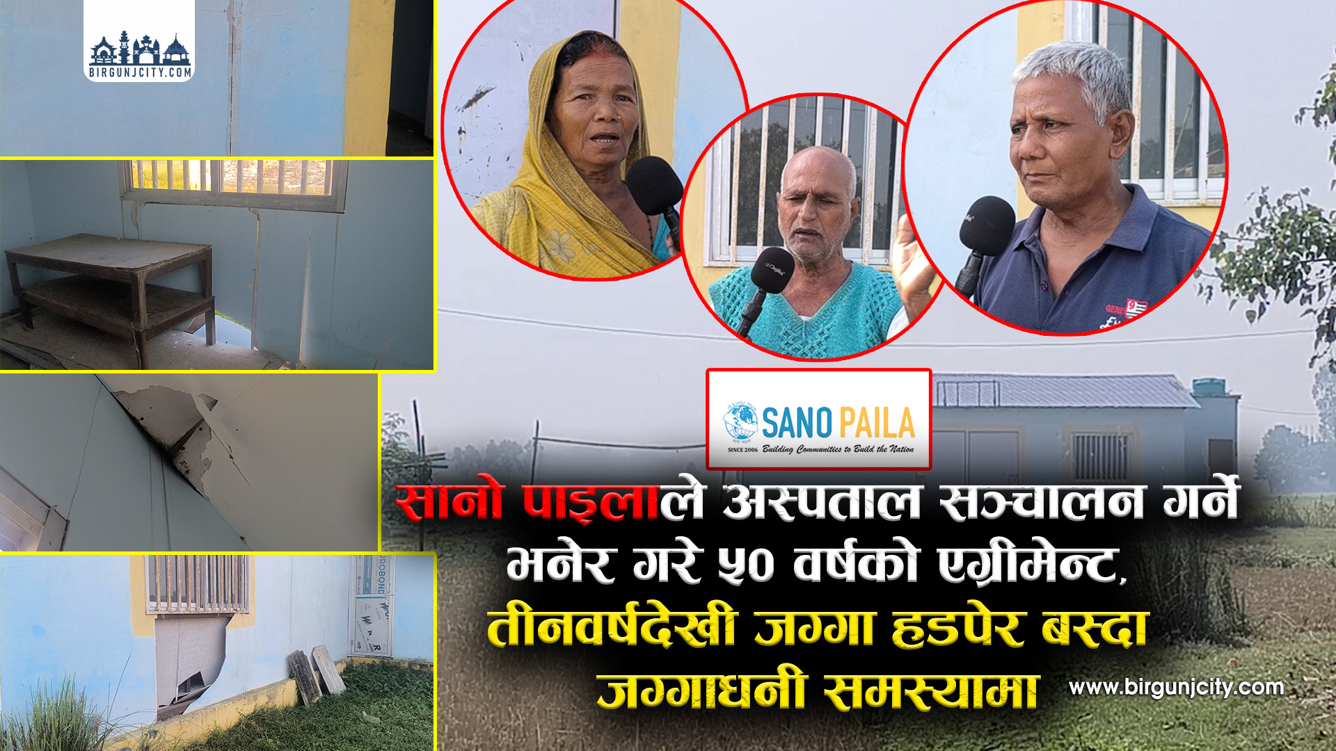 वीरगंज महानगरपालिका–३१, बेल्वास्थित सानो पाइलाले अस्पताल सञ्चालनका लागि निःशुल्क रुपमा लिएको दुई कट्ठा जग्गा तीन वर्षदेखि अलपत्र छोडेको छ । १० लाख समेत खर्च नभएको भवनमा ६० लाख खर्च देखाएर सञ्चालन गर्ने भनेर अलपत्र छाडेको स्थानीयहरूले आरोप लगाएका छन् । “गरिब र विपन्नको उपचार गर्ने उद्देश्य” भन्दै ५० वर्षका लागि जग्गा सम्झौता गरेर लिइएको भए पनि अस्पताल हालसम्म सञ्चालनमा नआएपछि उक्त भवन जिर्ण बनेको छ भने, जग्गाधनी समस्यामा परेका छन् ।