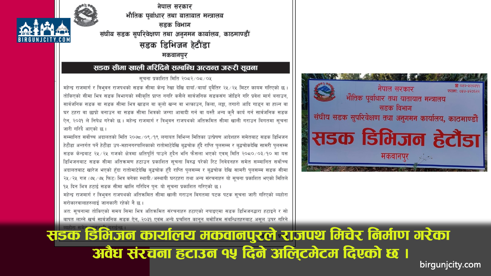 सडक डिभिजन कार्यालय मकवानपुरले महेन्द्र राजमार्ग र त्रिभुवन राजपथ मिचेर निर्माण गरिएका अवैध संरचना हटाउन १५ दिने अल्टिमेटम दिएको छ ।