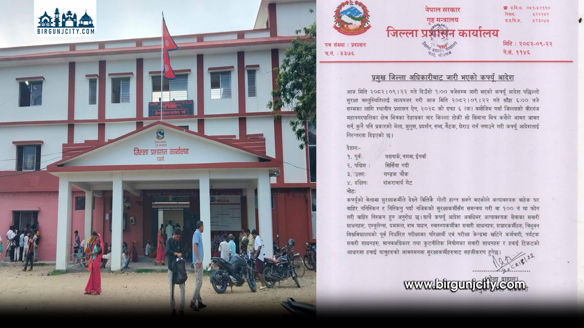 वीरगन्ज महानगरपालिकाका संवेदनशील क्षेत्रहरूमा लागू गरिएको कर्फ्यु आदेश पुनः लम्ब्याइएको छ । शान्ति–सुरक्षा अवस्था अझै पूर्ण रूपमा सामान्य हुन नसकेको भन्दै जिल्ला प्रशासन कार्यालय पर्साले कर्फ्यु अवधि थप गरेको हो ।