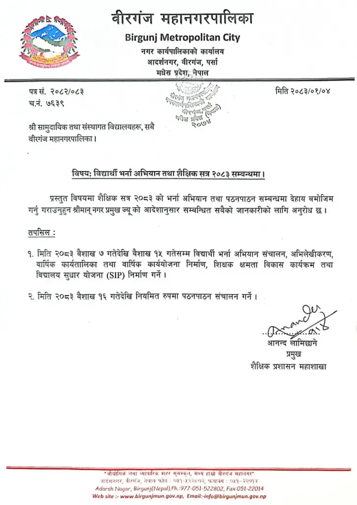 वीरगंज महानगरपालिकाले नयाँ शैक्षिक सत्र २०८३/०८४ का लागि सामुदायिक तथा निजी विद्यालयहरूमा विद्यार्थी भर्ना अभियान सञ्चालन गर्न निर्देशन जारी गरेको छ ।